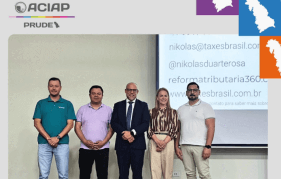 Estiveram presentes a presidente da ACIAP, Carolina, e o executivo Renato, que acompanharam as explicações técnicas sobre o novo modelo de tributação e sua aplicação prática no ambiente empresarial.