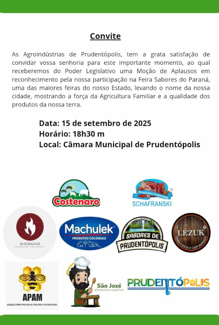 As agroindústrias de Prudentópolis terão um momento especial de reconhecimento nesta segunda-feira, 15 de setembro de 2025. Às 18h30, na Câmara Municipal de Prudentópolis, representantes das empresas locais receberão do Poder Legislativo uma Moção de Aplausos, em reconhecimento à participação na Feira Sabores do Paraná, considerada uma das maiores feiras do estado.