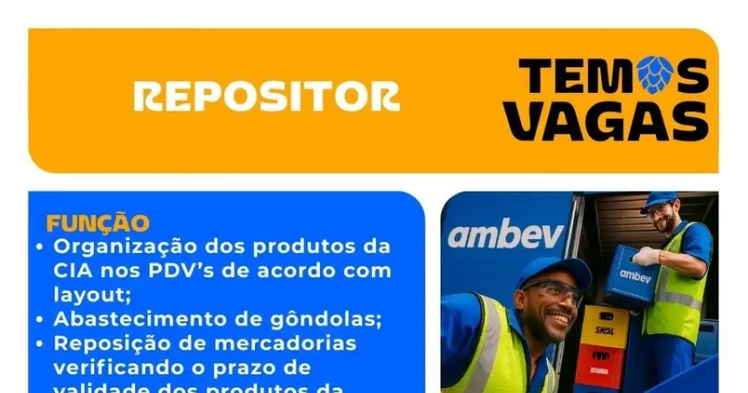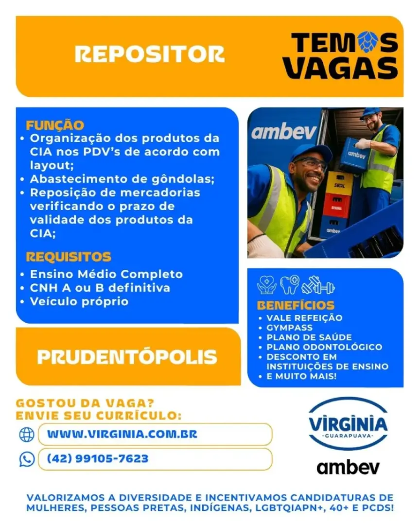 A Ambev, em parceria com a distribuidora Virgínia, anunciou a abertura de vaga para repositor em Prudentópolis. A função envolve a organização e reposição de produtos da empresa nos pontos de venda, abastecimento de gôndolas e verificação do prazo de validade dos itens.
