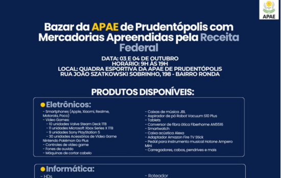 O bazar acontece nos dias 4 e 5 de outubro, na Quadra Esportiva da APAE de Prudentópolis (Rua João Sztakowski Sobrinho, 196 – Bairro Ronda). A ação reúne oportunidades com preços atrativos e tem caráter social: a renda auxilia a manutenção dos serviços prestados pela instituição no município.