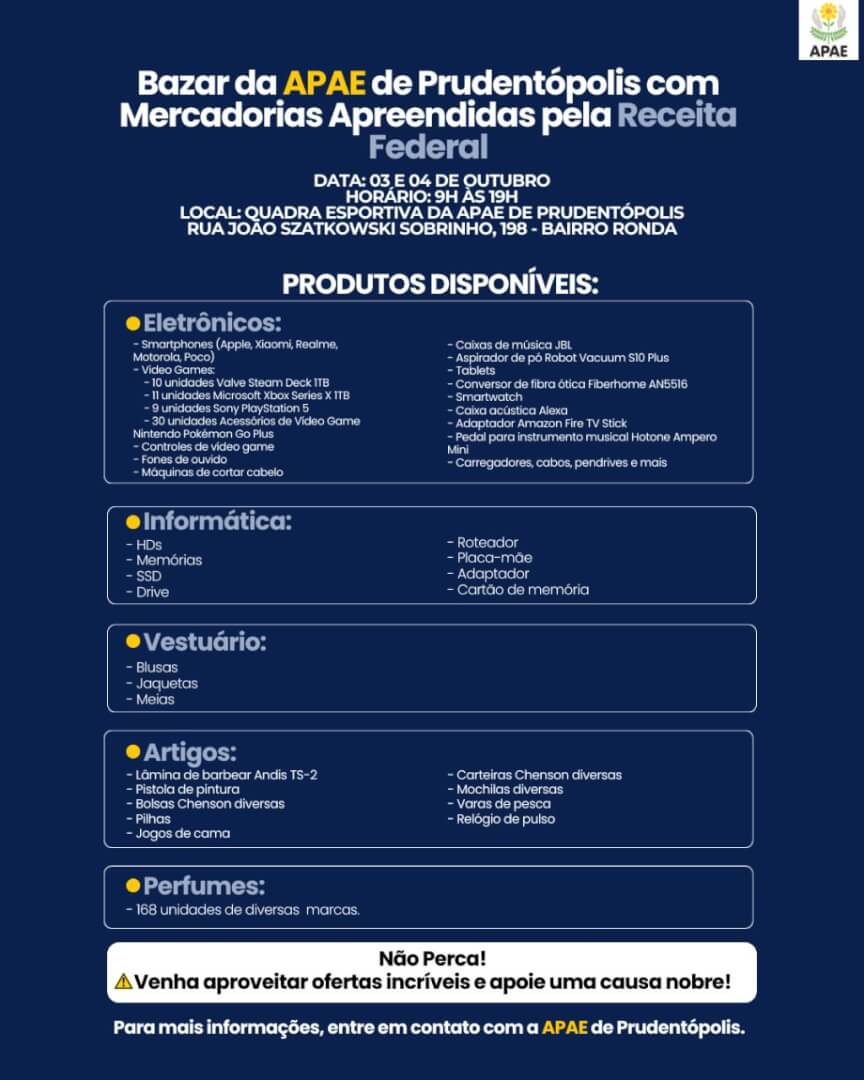A APAE de Prudentópolis publicou a lista dos produtos com valores que serão vendidos no Bazar de Mercadorias Apreendidas pela Receita Federal. A relação detalhada, separada por categorias como eletrônicos, informática, vestuário, utilidades e perfumes, já pode ser consultada online: https://drive.google.com/file/d/16y081SKWgwcEPKdhXijBBGc07911aX3f/view?fbclid=PAZXh0bgNhZW0CMTEAAadBrE0R1wIlR5V5db5WrLkC8lw-sEF9ZVv7Vc3X9zGMtShwUgV-wSjmKxqhdQ_aem_orq_dFza4419Wlt_Fiw2TA.