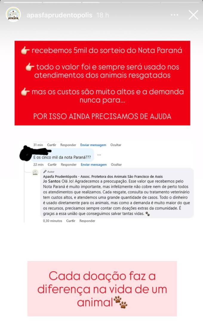 A Associação Protetora dos Animais São Francisco de Assis (APASFA) de Prudentópolis utilizou suas redes sociais para reforçar a importância do apoio da comunidade no cuidado com animais resgatados. Em publicações recentes, a entidade destacou que, embora tenha recebido R$ 5 mil do programa Nota Paraná, os custos com tratamentos e atendimentos veterinários continuam muito elevados, tornando indispensável a colaboração da sociedade.