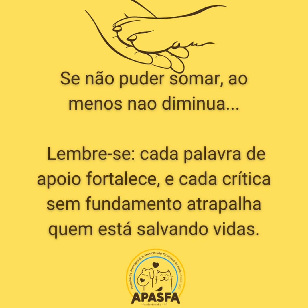 A APASFA ressaltou ainda que nem todos têm condições de ajudar financeiramente ou com doações, mas pediu que, ao menos, críticas sem fundamento sejam evitadas. Segundo a instituição, palavras de apoio fortalecem o trabalho voluntário, enquanto comentários negativos atrapalham o resgate e o tratamento de animais em situação de abandono e maus-tratos.