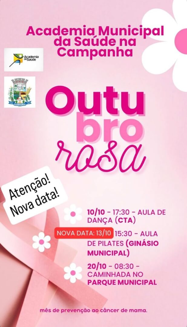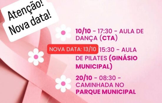 A Campanha Outubro Rosa em Guamiranga, organizada pela Academia Municipal de Saúde, anunciou alteração na programação. A aula de pilates, antes marcada para o dia 10, será realizada no dia 13 de outubro, às 15h30, no Ginásio Municipal de Esportes.