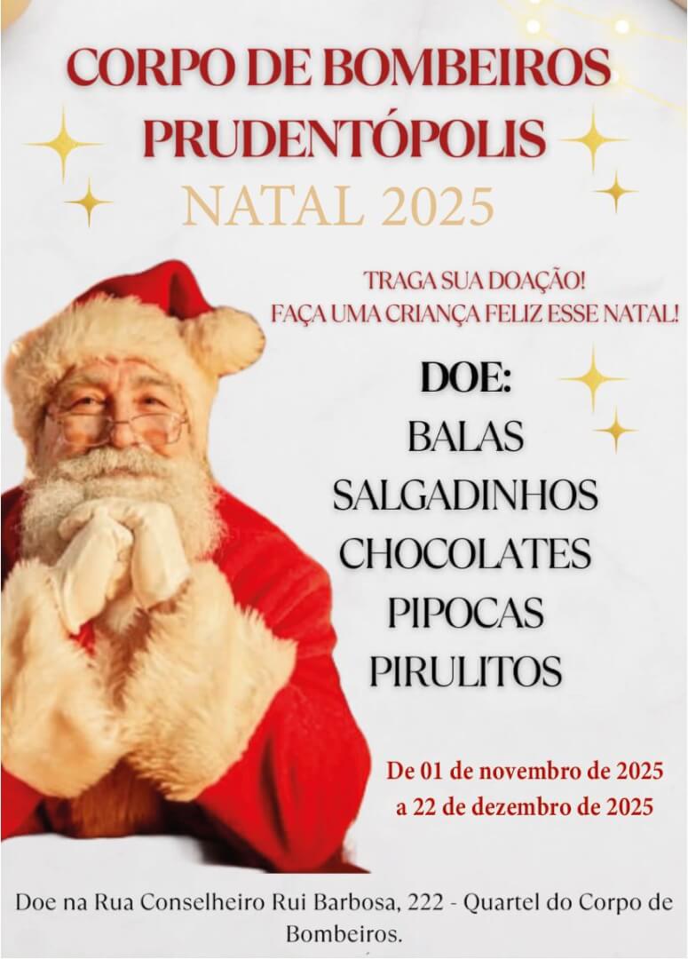 O Corpo de Bombeiros deu início à campanha de Natal 2025 para arrecadar guloseimas que serão distribuídas a crianças de Prudentópolis. As doações, balas, salgadinhos, chocolates, pipocas e pirulitos, podem ser entregues de 1º de novembro a 22 de dezembro de 2025 em diversos pontos de coleta.