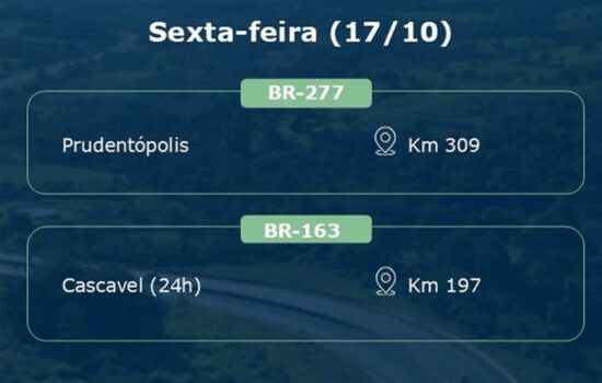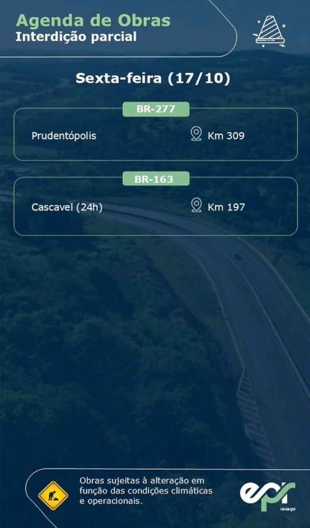 A concessionária EPR Iguaçu programou interdição parcial na BR-277, km 309, em Prudentópolis, nesta sexta-feira (17/10). A ação integra a agenda de obras na rodovia e poderá gerar redução de velocidade e formação de filas no trecho.