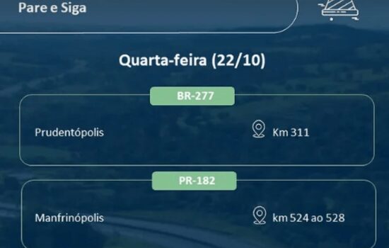 A EPR Iguaçu informou que haverá operação “pare e siga” no km 311 da BR-277, em Prudentópolis, nesta quarta-feira (22). A intervenção ocorre para execução de serviços na pista e pode provocar redução de velocidade e formação de filas no trecho.