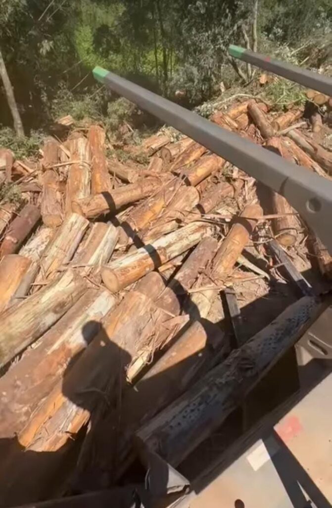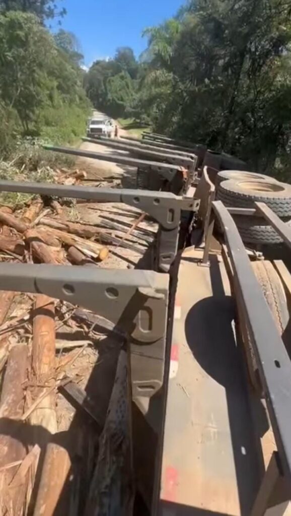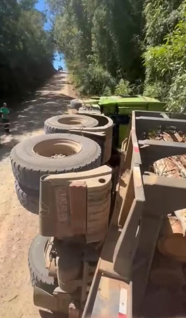 Uma carreta carregada com toras de madeira tombou no final da manhã desta quarta-feira (14) na localidade de Linha Ivaí Velho, no interior de Prudentópolis.