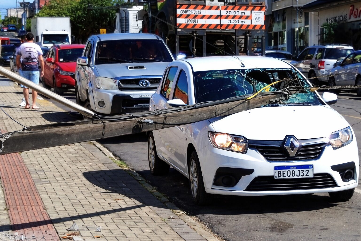A equipe policial, que realizava patrulhamento pela região, constatou que a via já estava sinalizada pelo órgão municipal de trânsito no momento da chegada. Em contato com o proprietário do automóvel atingido, Roberto Montes Neto, de 53 anos, ele relatou que havia deixado seu Renault Sandero estacionado quando a carreta, ao trafegar pela via, acabou enroscando a carga nos fios, ocasionando a queda do poste e os danos na parte frontal do veículo.