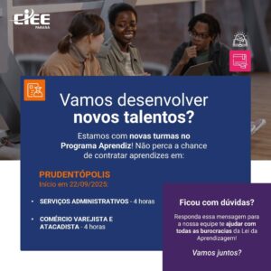 O CIEE Paraná anunciou a abertura de novas turmas do Programa Aprendiz no município de Prudentópolis, com início previsto para o dia 22 de setembro de 2025. A iniciativa representa uma oportunidade estratégica para empresas locais que desejam cumprir a Lei da Aprendizagem (Lei 10.097/2000), ao mesmo tempo em que investem na formação de jovens talentos. Com turmas nas áreas de Serviços Administrativos e Comércio Varejista e Atacadista, o programa tem foco no desenvolvimento profissional e na inclusão de adolescentes e jovens no mercado de trabalho formal.