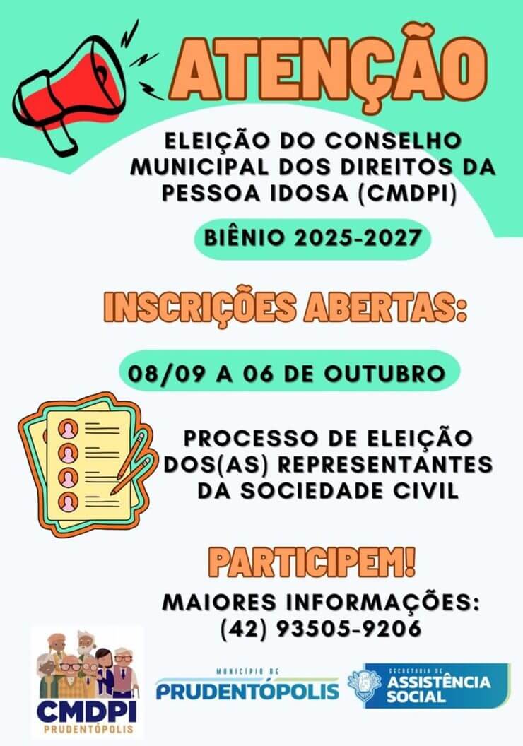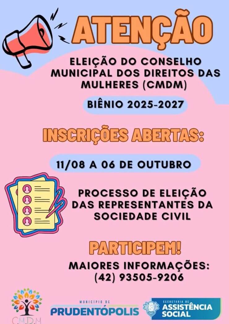 O município de Prudentópolis abriu inscrições para o processo de eleição dos novos membros dos Conselhos Municipais dos Direitos da Mulher (CMDM) e da Pessoa Idosa (CMDPI), referentes ao biênio 2025-2027. A iniciativa busca a participação ativa da sociedade civil na defesa e no fortalecimento das políticas públicas voltadas a esses segmentos.