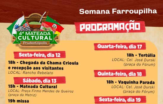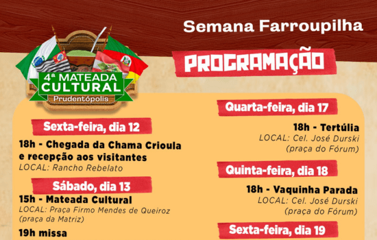 A Semana Farroupilha de Prudentópolis já tem programação definida e promete movimentar a cidade entre os dias 12 e 21 de setembro, com atividades que valorizam a cultura gaúcha e reúnem a comunidade em celebrações tradicionais. A agenda inclui cavalgada, tertúlia, fandango, apresentações culturais, missa e jantar campeiro, além da chegada da Chama Crioula e do tradicional café tropeiro.