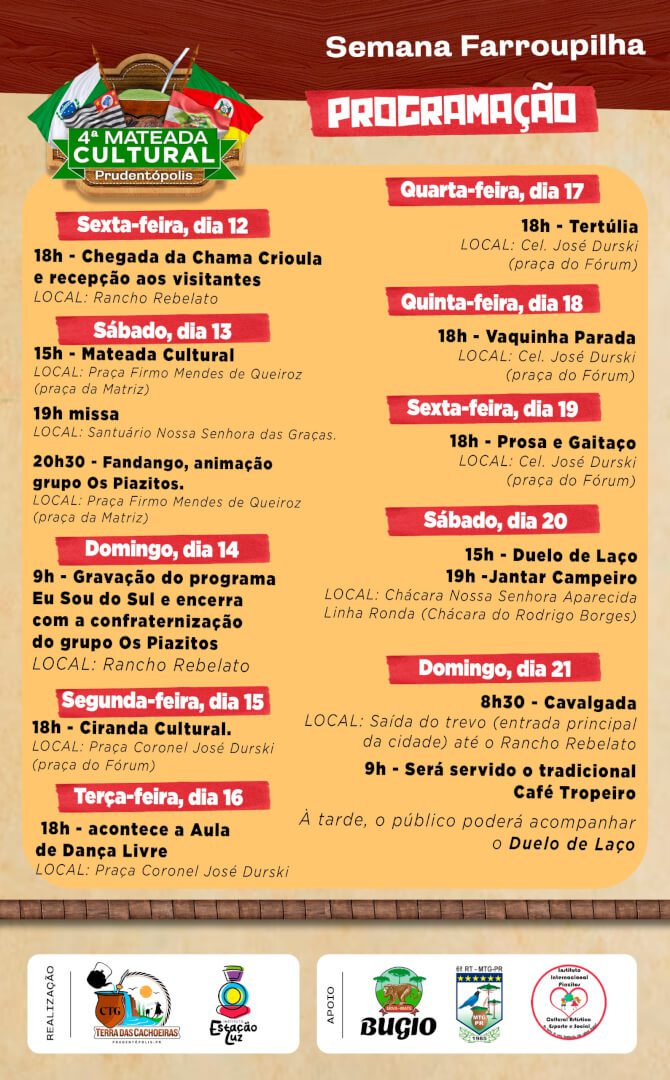 As festividades começam na sexta-feira (12), às 18h, com a chegada da Chama Crioula e recepção aos visitantes no Rancho Rebelato. No sábado (13), a Praça Firmo Mendes de Queiroz será palco da Mateada Cultural a partir das 15h, seguida de missa no Santuário Nossa Senhora das Graças e fandango com o grupo Os Piazitos.