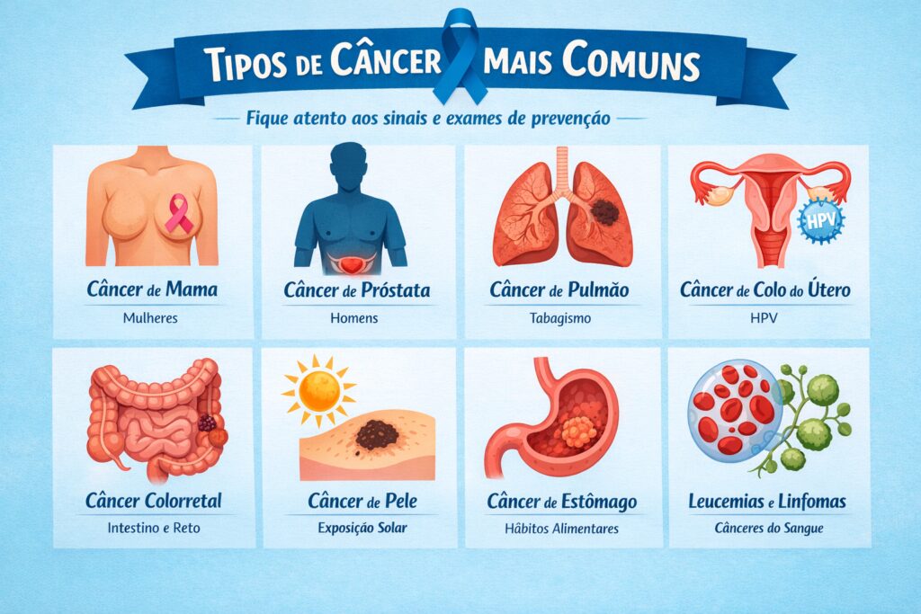 Outros tipos recorrentes incluem o câncer de pele, especialmente em regiões com alta exposição solar, o câncer de estômago, o câncer de fígado e os cânceres hematológicos, como leucemias e linfomas. Cada um apresenta sintomas, fatores de risco e formas de tratamento específicas, o que torna essencial a orientação médica individualizada.