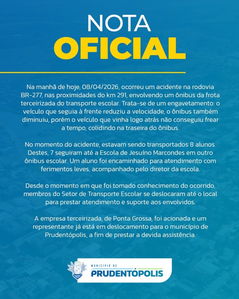 Um acidente do tipo engavetamento foi registrado por volta das 6h30 da manhã desta quarta-feira (08), na BR-277, na localidade de Marcondes, interior de Prudentópolis. A colisão envolveu um ônibus escolar do município e dois caminhões, mobilizando equipes de atendimento e chamando a atenção de motoristas que passavam pelo trecho.