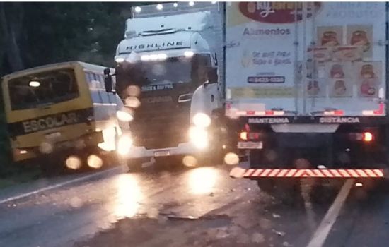Um acidente do tipo engavetamento foi registrado por volta das 6h30 da manhã desta quarta-feira (08), na BR-277, na localidade de Marcondes, interior de Prudentópolis. A colisão envolveu um ônibus escolar do município e dois caminhões, mobilizando equipes de atendimento e chamando a atenção de motoristas que passavam pelo trecho.