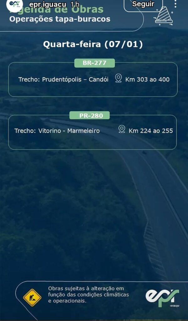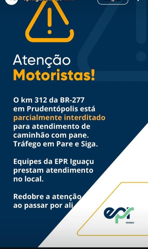 A concessionária EPR Iguaçu emitiu um importante aviso aos motoristas que trafegam pela BR-277, no trecho que passa por Prudentópolis, alertando para obras na pista e interdição parcial que podem impactar o fluxo de veículos ao longo desta quarta-feira (07).De acordo com a concessionária, estão programadas operações tapa-buracos na BR-277, entre Prudentópolis e Candói, abrangendo o trecho do km 303 ao km 400. Os trabalhos fazem parte do cronograma de manutenção da rodovia e têm como objetivo melhorar as condições de tráfego e garantir mais segurança aos usuários.Além disso, a EPR Iguaçu informou que o km 312 da BR-277, em Prudentópolis, encontra-se parcialmente interditado devido ao atendimento a um caminhão com pane mecânica. No local, o tráfego opera em sistema de “Pare e Siga”, o que pode gerar lentidão, especialmente em horários de maior movimento.
