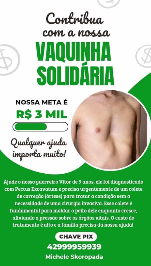 A família do menino Vitor, de 9 anos, está pedindo ajuda da comunidade para arrecadar R$ 3 mil e comprar um colete especial que ele precisa com urgência após ser diagnosticado com Pectus Excavatum, uma deformidade no tórax que pode afetar a respiração e o funcionamento de órgãos vitais.
