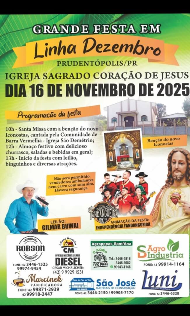 A comunidade da Linha Dezembro, no interior de Prudentópolis (PR), realiza no domingo, 16 de novembro de 2025, a tradicional festa da Igreja Sagrado Coração de Jesus, com programação religiosa, almoço festivo e atividades de integração ao longo de todo o dia.
