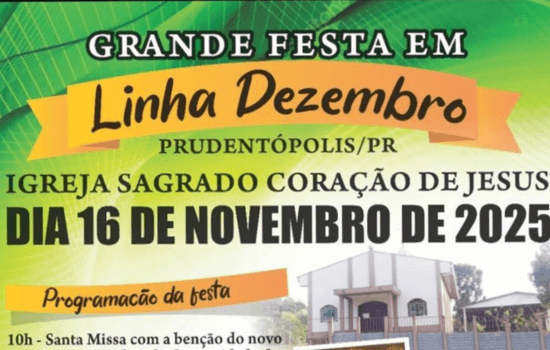 A comunidade da Linha Dezembro, no interior de Prudentópolis (PR), realiza no domingo, 16 de novembro de 2025, a tradicional festa da Igreja Sagrado Coração de Jesus, com programação religiosa, almoço festivo e atividades de integração ao longo de todo o dia.