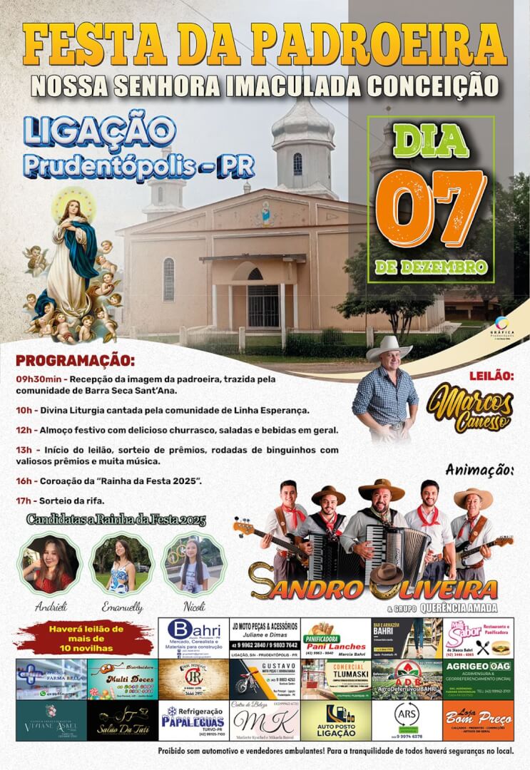 A comunidade de Ligação, em Prudentópolis, realiza no domingo (07/12) a Festa da Padroeira Nossa Senhora Imaculada Conceição. O evento inicia às 9h30, reúne atividades religiosas e sociais ao longo do dia e terá atrações como almoço festivo, leilão conduzido por Marcos Canesso, rodadas de binguinhos, show de Sandro Oliveira & Grupo Querência Nativa, além da coroação da Rainha da Festa 2025 e sorteio de rifa. Haverá leilão de mais de 10 novilhas.