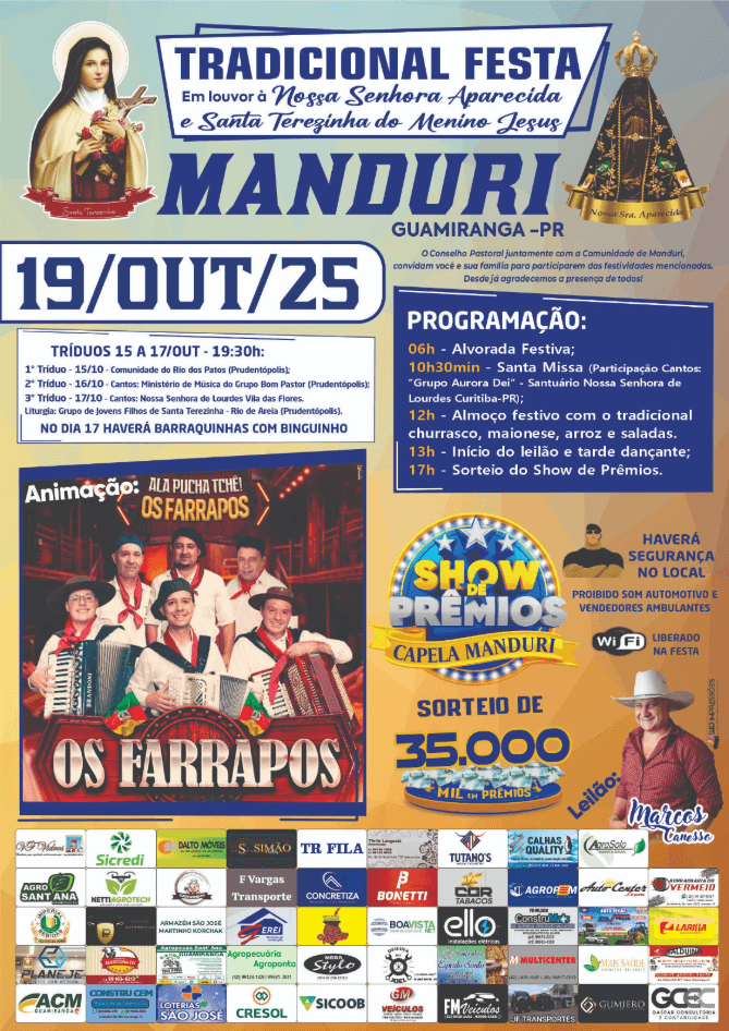 A comunidade de Manduri, em Guamiranga, se prepara para receber no dia 19 de outubro a tradicional festa em louvor a Nossa Senhora Aparecida e Santa Terezinha do Menino Jesus. O evento contará com programação religiosa, atrações culturais, almoço festivo, leilão, show de prêmios e animação musical com o grupo Os Farrapos.