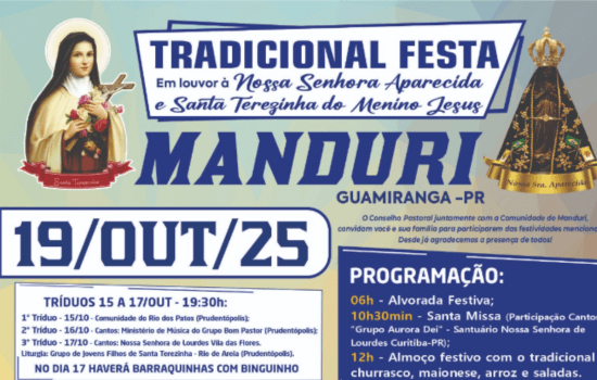 A comunidade de Manduri, em Guamiranga, se prepara para receber no dia 19 de outubro a tradicional festa em louvor a Nossa Senhora Aparecida e Santa Terezinha do Menino Jesus. O evento contará com programação religiosa, atrações culturais, almoço festivo, leilão, show de prêmios e animação musical com o grupo Os Farrapos.