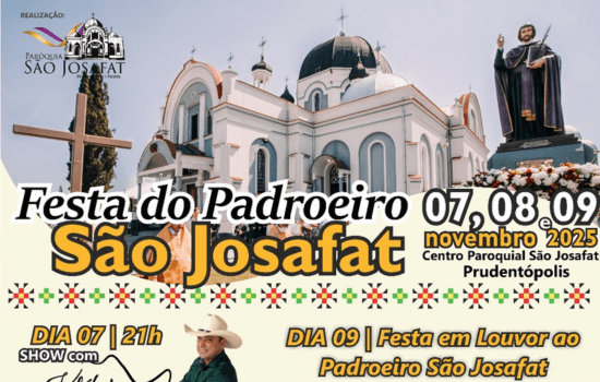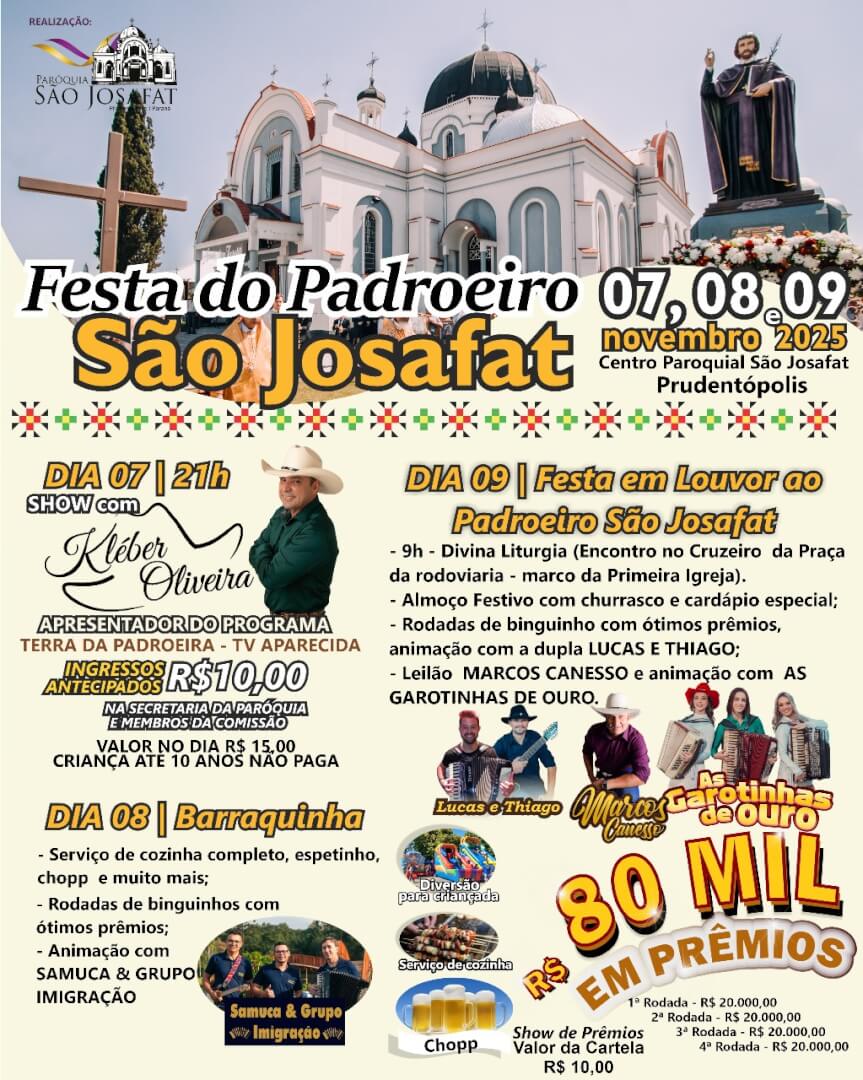 Nos dias 7, 8 e 9 de novembro, de sexta a domingo, Prudentópolis se prepara para viver um dos eventos mais aguardados do ano: a Festa do Padroeiro São Josafat, que reunirá fiéis e visitantes no Centro Paroquial São Josafat. A programação inclui momentos religiosos, atrações culturais e musicais, além de sorteios que somam R$ 80 mil em prêmios.
