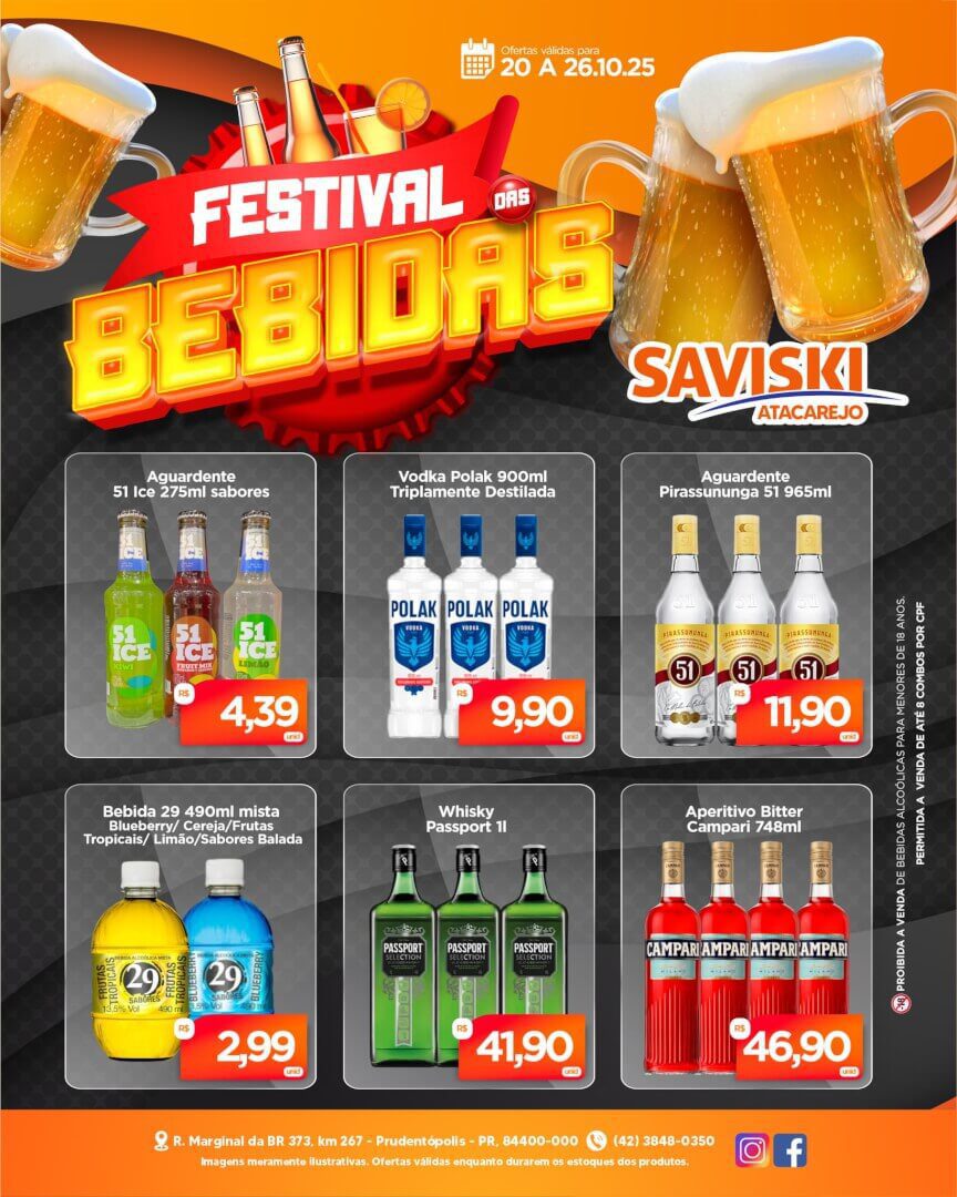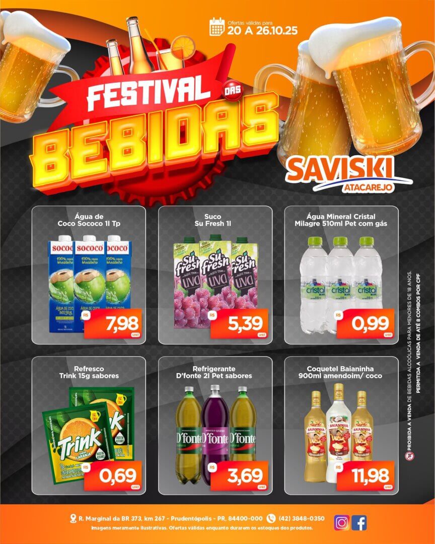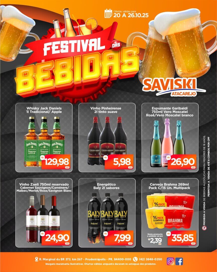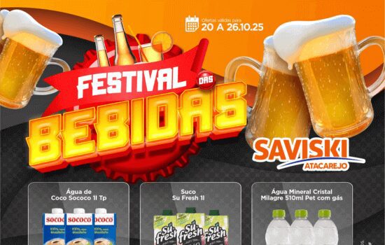 O Saviski Atacarejo realiza nesta semana o Festival das Bebidas, oferecendo uma seleção de produtos com preços promocionais para quem quer aproveitar momentos de lazer e confraternização. A ação acontece de 20 a 26 de outubro, com descontos em diversas marcas de vinhos, espumantes, cervejas, energéticos e destilados.