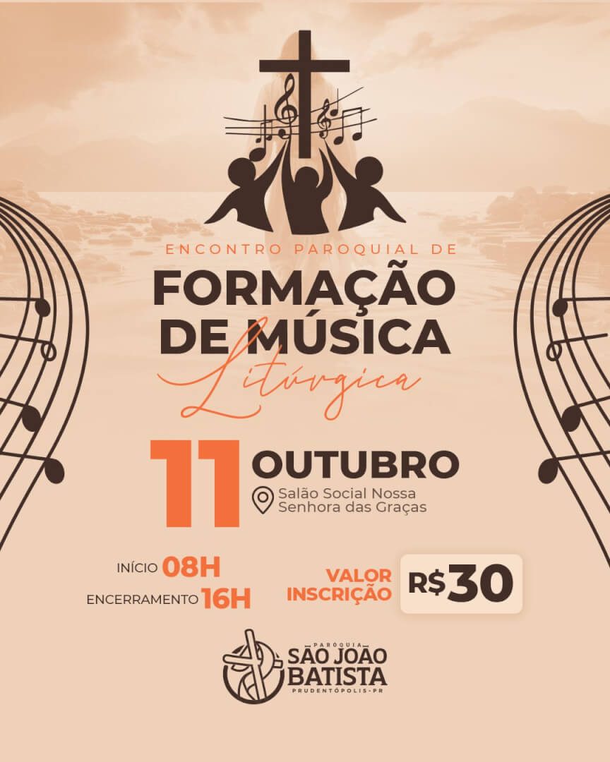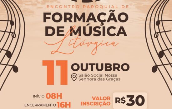A Paróquia São João Batista promove neste sábado (11), no Salão Social Nossa Senhora das Graças, o Encontro Paroquial de Formação de Música Litúrgica. O evento tem início às 8h e se estende até às 16h, reunindo músicos, cantores e agentes pastorais interessados em fortalecer a música como parte essencial da liturgia.