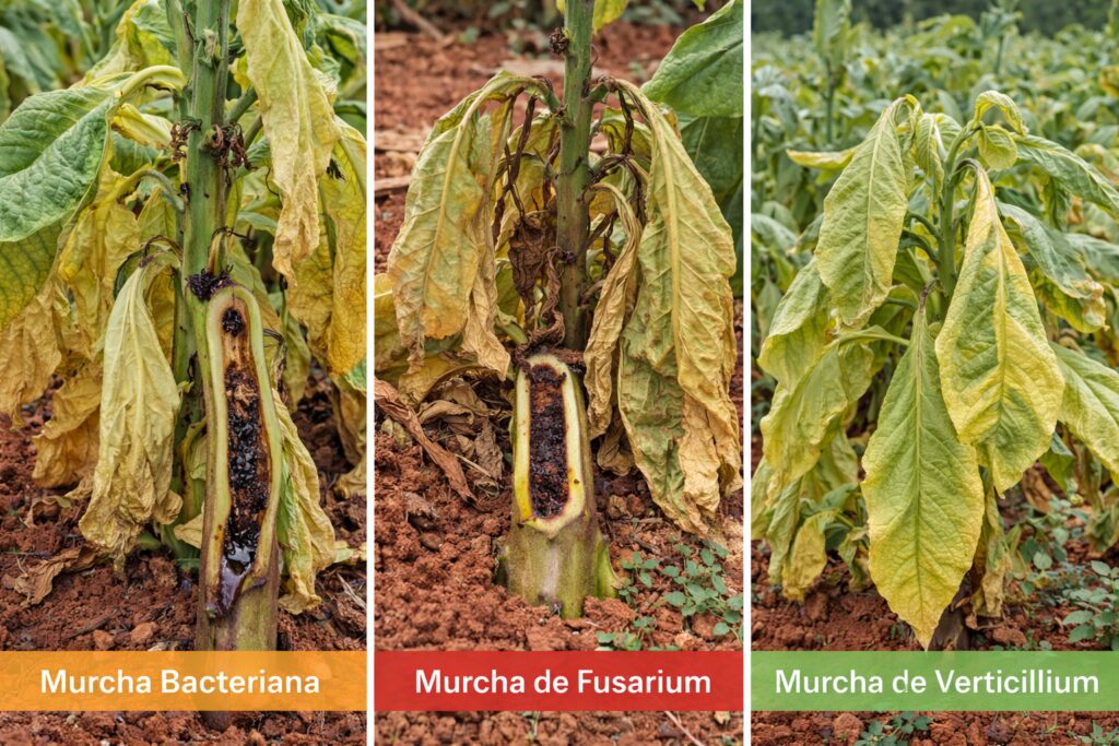 Entre as doenças mais preocupantes estão as chamadas murchas vasculares, que atingem o sistema interno da planta e impedem a circulação de água e nutrientes.