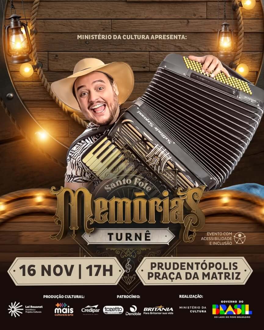 A Praça da Matriz, em Prudentópolis, receberá no domingo, 16 de novembro, às 17h, o último espetáculo da turnê “Santo Fole Memórias”, apresentação gratuita do acordeonista Paulinho Pezak e sua banda, promovida pelo Ministério da Cultura. O evento encerra o circuito com um show aberto ao público e estrutura de acessibilidade e inclusão.