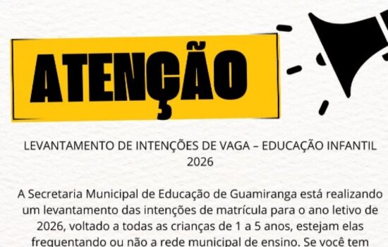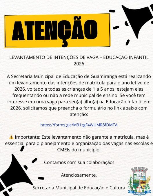 A Secretaria Municipal de Educação de Guamiranga abriu o levantamento das intenções de matrícula para o ano letivo de 2026, direcionado às crianças de 1 a 5 anos que ainda não frequentam a rede municipal de ensino. O formulário, disponível de forma online, deve ser preenchido pelos pais ou responsáveis que desejam uma vaga na Educação Infantil para seus filhos.