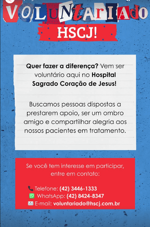 O Hospital Sagrado Coração de Jesus está com inscrições abertas para o programa de voluntariado e convida pessoas que desejam “fazer a diferença” a apoiar pacientes durante o período de tratamento. A proposta é simples e humana: ser presença, ouvir, oferecer companhia e levar um pouco de alegria a quem está internado.