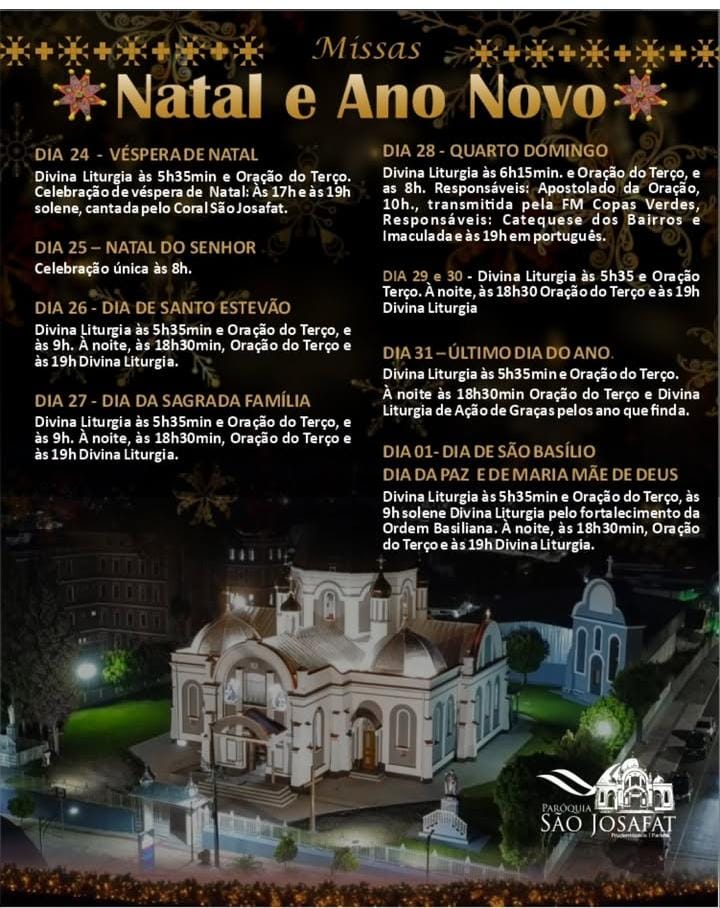 A Igreja São Josafat, em Prudentópolis, divulgou os horários das missas de Ano Novo, realizadas após o almoço e no período da noite, voltadas aos fiéis que desejam encerrar o ano em oração e iniciar um novo ciclo fortalecidos pela fé. As celebrações reforçam a tradição cristã de agradecer a Deus pelo ano vivido e de entregar o futuro aos cuidados do Salvador.