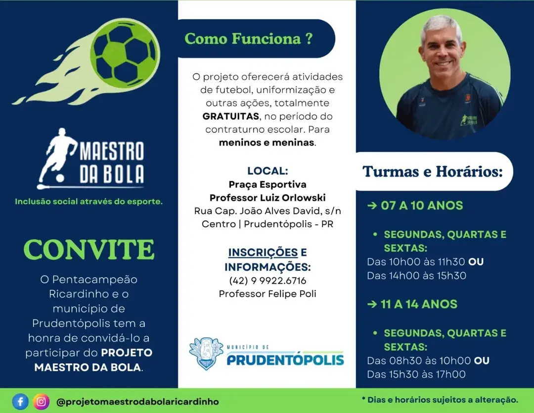 O projeto Maestro da Bola está com inscrições abertas em Prudentópolis e oferece, de forma gratuita, atividades de futebol no contraturno escolar para meninos e meninas de 7 a 14 anos. As aulas serão realizadas na Praça Esportiva Professor Luiz Orlowski, na Rua Capitão João Alves David, s/n, Centro. As inscrições e demais informações são com o professor Felipe Poli, pelo telefone/WhatsApp (42) 9 9922-6716.