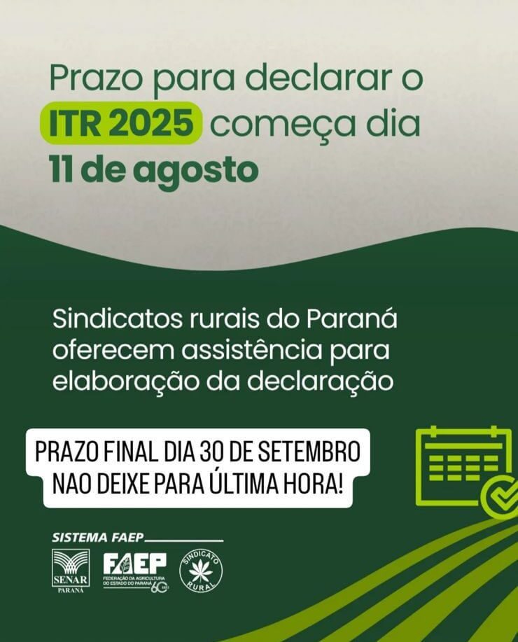 Em Prudentópolis e em todo o estado, os sindicatos rurais vinculados ao Sistema FAEP/SENAR estão auxiliando gratuitamente na elaboração e no envio do documento. A orientação é revisar dados cadastrais, documentos da propriedade e eventuais pendências antes da transmissão, garantindo regularidade fiscal junto à Receita Federal.