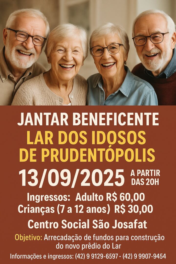 O Lar dos Idosos de Prudentópolis promove neste sábado, 13 de setembro de 2025, um jantar beneficente com o objetivo de arrecadar recursos para a ampliação da instituição e a construção de novos quartos. O evento acontece no Centro Social São Josafat, a partir das 20h.