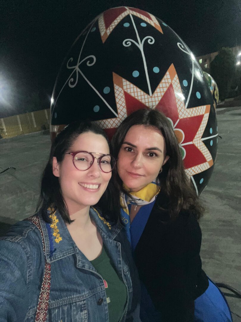Ao chegar à cidade, Katerina se surpreendeu com a preservação da cultura ucraniana em todos os detalhes. “Achei que veria Pêssankas e outros elementos culturais em pontos específicos, mas vi a Ucrânia em todos os lugares: lojas, praças, na prefeitura, em estátuas. Foi emocionante e não tinha ideia da dimensão”, relatou. Ela percebeu semelhanças entre as tradições locais e as que vivia na Ucrânia, principalmente na religião, culinária e folclore. Participou de missas em ucraniano, almoçou pratos e acompanhou ensaios de dança ucraniana com o Grupo Folclórico Ucraniano Brasileiro Vesselka, experiências que reforçaram suas memórias e vínculos culturais.