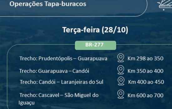 A concessionária EPR Iguaçu incluiu o trecho Prudentópolis–Guarapuava na agenda de obras desta terça-feira (28/10), com execução de serviços de tapa-buracos na BR-277 entre o km 298 e o km 350. O trabalho faz parte do cronograma de conservação da rodovia e pode causar lentidão temporária, com estreitamento de pista e orientação de equipes no local.