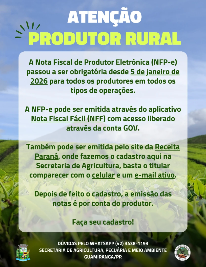A Nota Fiscal de Produtor Eletrônica (NFP-e) passou a ser obrigatória desde 5 de janeiro de 2026 para todos os produtores rurais, em qualquer tipo de operação. A exigência segue a Norma de Procedimento Fiscal nº 32/2025 da Receita Estadual do Paraná e vale também para os produtores de Guamiranga, que devem realizar o cadastro para continuar emitindo notas regularmente.