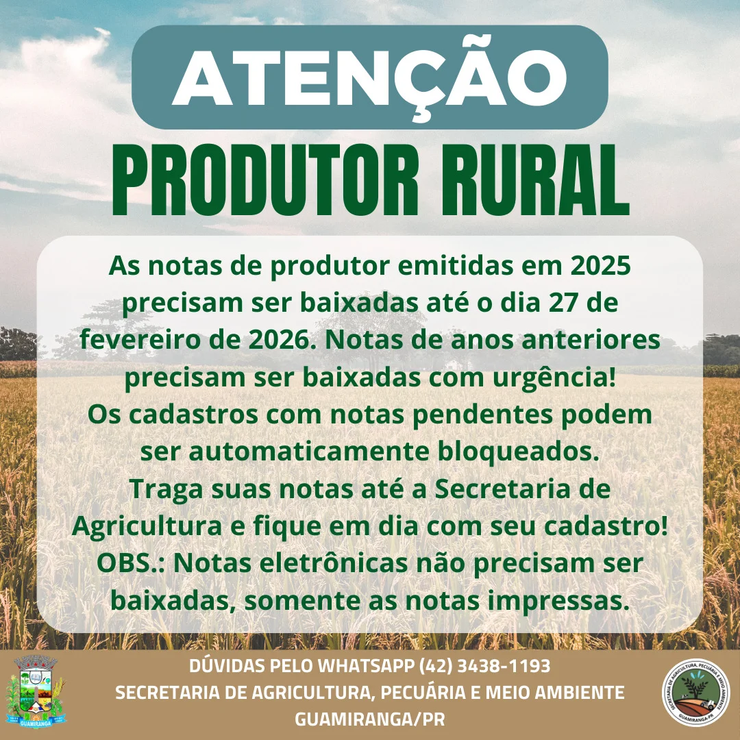 A orientação reforça ainda que produtores que mantêm notas impressas devem ficar atentos à regularização: documentos de 2025 precisam ser baixados até 27 de fevereiro de 2026, enquanto notas de anos anteriores exigem baixa imediata, sob risco de bloqueio automático do cadastro. Dúvidas e atendimentos podem ser feitos pelo WhatsApp da Secretaria de Agricultura, pelo telefone (42) 3438-1193.