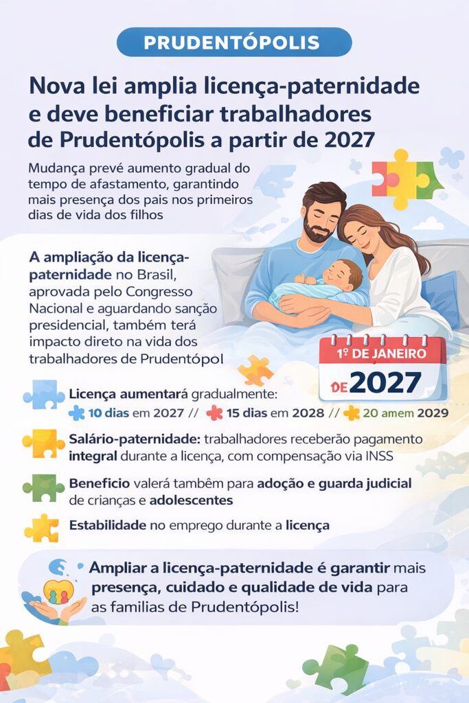 A ampliação da licença-paternidade no Brasil, aprovada pelo Congresso Nacional e aguardando sanção presidencial, também terá impacto direto na vida dos trabalhadores de Prudentópolis. A nova legislação estabelece o aumento gradual do período de afastamento remunerado, que atualmente é de 5 dias, podendo chegar a até 20 dias nos próximos anos, fortalecendo o vínculo familiar e ampliando a participação dos pais nos cuidados com os filhos desde os primeiros dias de vida.
