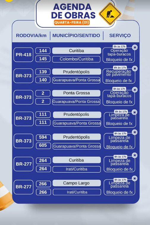 Motoristas que trafegam pelas BRs 373 e 277, além da PR-418, devem redobrar a atenção nesta quarta-feira (1º), devido à realização de serviços de manutenção e recuperação em diferentes trechos do Paraná. As intervenções incluem operações tapa-buracos, limpeza de passarelas e recuperação de pavimento, com bloqueios parciais de faixas em diversos pontos.