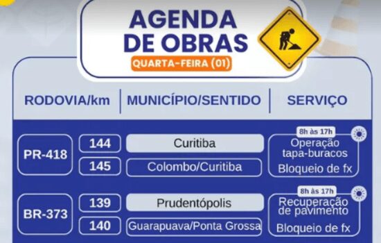 Em Prudentópolis, os trabalhos de recuperação de pavimento acontecem no km 140 da BR-373, sentido Guarapuava/Ponta Grossa, com bloqueio de faixa programado. Já nos kms 111 e 594, também em Prudentópolis, equipes atuam na limpeza de passarelas, o que pode ocasionar retenções.