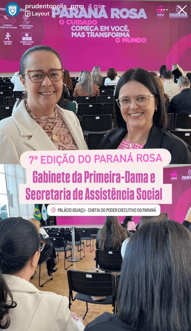 O Governo do Paraná promoveu nesta semana, no Palácio Iguaçu, em Curitiba, a 7ª edição do programa Paraná Rosa, iniciativa que busca fortalecer políticas públicas de atenção à saúde, bem-estar e qualidade de vida das mulheres paranaenses. Representando Prudentópolis, estiveram presentes a Primeira-Dama e a Secretaria Municipal de Assistência Social, que acompanharam as atividades e debates do encontro.