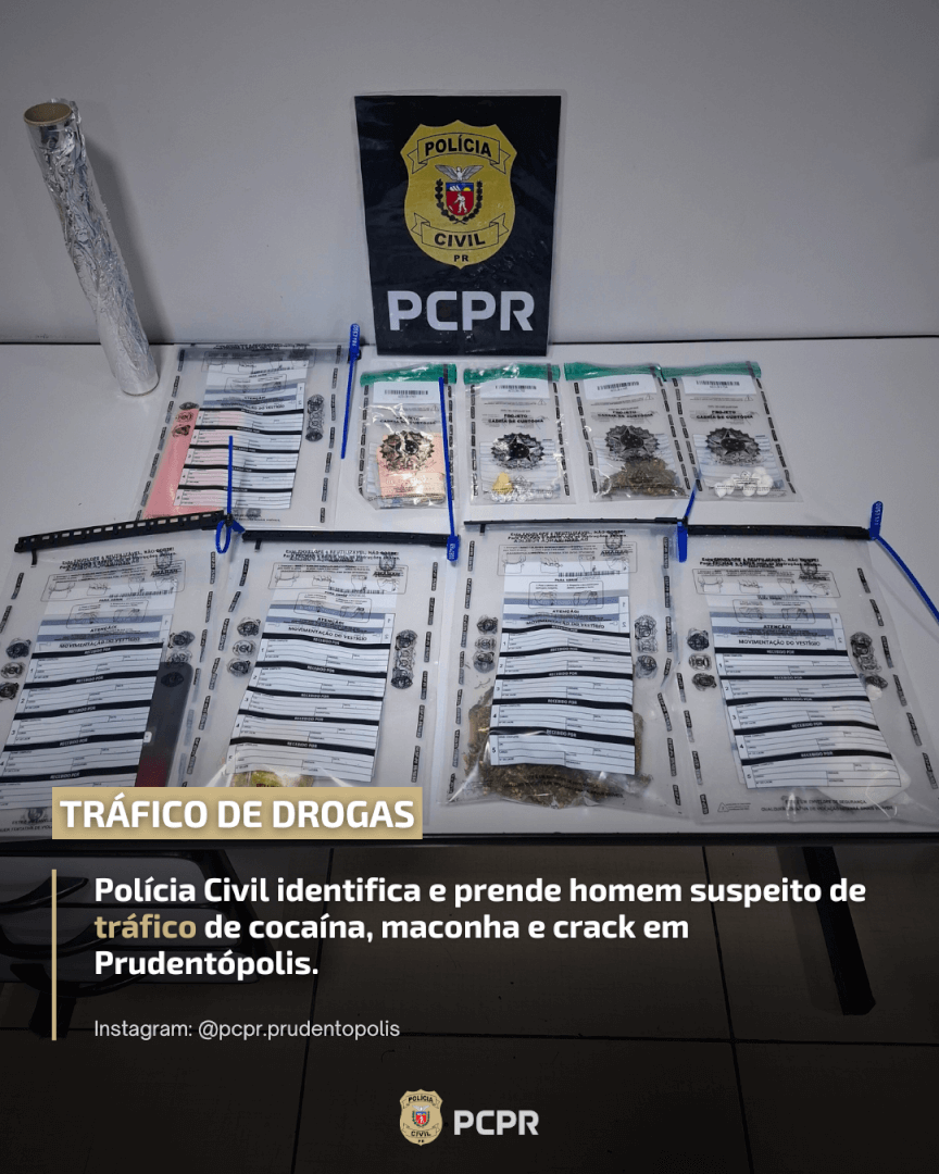 Na manhã desta quarta-feira (22 de outubro de 2025), por volta das 11h, a Polícia Civil do Paraná prendeu um homem de 42 anos e apreendeu porções de cocaína, maconha e crack durante o cumprimento de mandado de busca e apreensão em uma residência na Vila Mariana, em Prudentópolis.