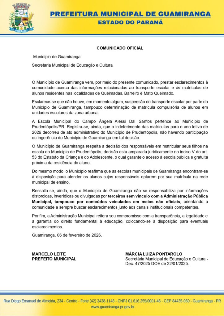 No comunicado, o município afirma que não houve, em nenhum momento, suspensão do transporte escolar, nem determinação para matrícula obrigatória de estudantes em escolas da zona urbana. A administração também explicou que a Escola Municipal do Campo Ângela Alessi Dal Santos pertence ao município de Prudentópolis, e que o indeferimento de matrículas para o ano letivo de 2026 ocorreu por decisão administrativa de Prudentópolis, sem participação ou interferência do município de Guamiranga.