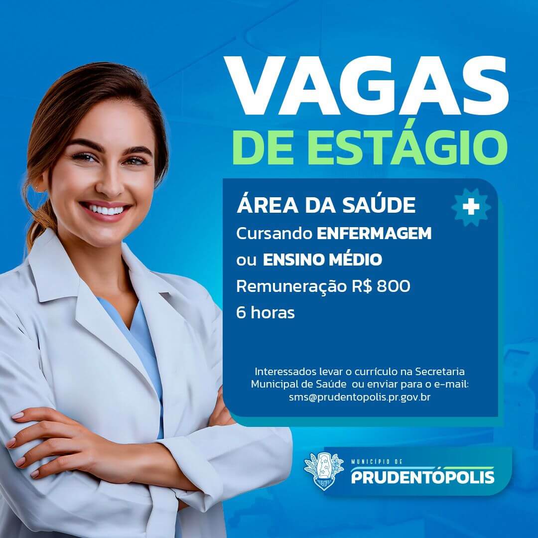 A Prefeitura de Prudentópolis anunciou a abertura de vagas de estágio voltadas para a área da saúde. A oportunidade é destinada a estudantes que estejam cursando Enfermagem ou ainda o Ensino Médio, oferecendo remuneração de R$ 800 para uma carga horária de seis horas diárias.