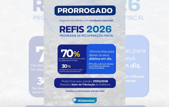 A Prefeitura de Prudentópolis prorrogou o prazo de adesão ao Programa de Recuperação Fiscal (REFIS 2026), oferecendo uma nova oportunidade para que contribuintes regularizem débitos municipais com condições facilitadas. O novo prazo segue até o dia 27 de fevereiro de 2026, permitindo que pessoas físicas e jurídicas negociem pendências tributárias com descontos especiais.